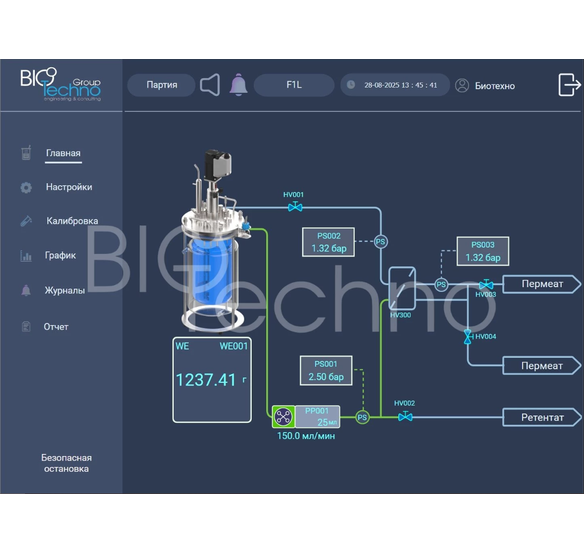 Система управления БИОТЕХНО на базе MasterSCADA 4D позволяет проводить мониторинг/управление и запись процесса фильтрации.