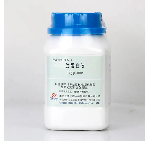 Триптон - это разновидность высококачественного пептона, представляющего собой светло-желтый порошок, изготовленный из свежей говядины и говяжьих костей, переваренных трипсином, концентрированных и высушенных.Он обладает хорошими физическими свойствами, такими как светлый цвет, растворимость, прозрачность и отсутствие осадков.Он богат источниками азота, аминокислотами и т.д. И может быть добавлен в различные микробные среды для культивирования, разделения, размножения и идентификации бактерий, а также в конфигурацию сред для тестирования биохимических свойств бактерий, таких как стерильные тестовые среды и среды для анаэробных бактерий