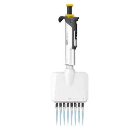 Механический восьмиканальный дозатор DLAB серии HiPette имеет небольшой вес и лёгкий ход кнопки дозирования.