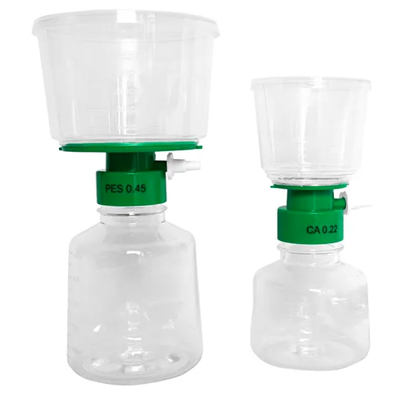 Одноразовые вакуумные фильтровальные установки используются при разделении образцов большого объема и очистке питательных сред для культивирования тканей, биологических жидкостей и буферов фиксации. Обеспечивают стерилизующую фильтрацию и осветление труднофильтруемых водных растворов за счет предфильтра из стекловолокна.